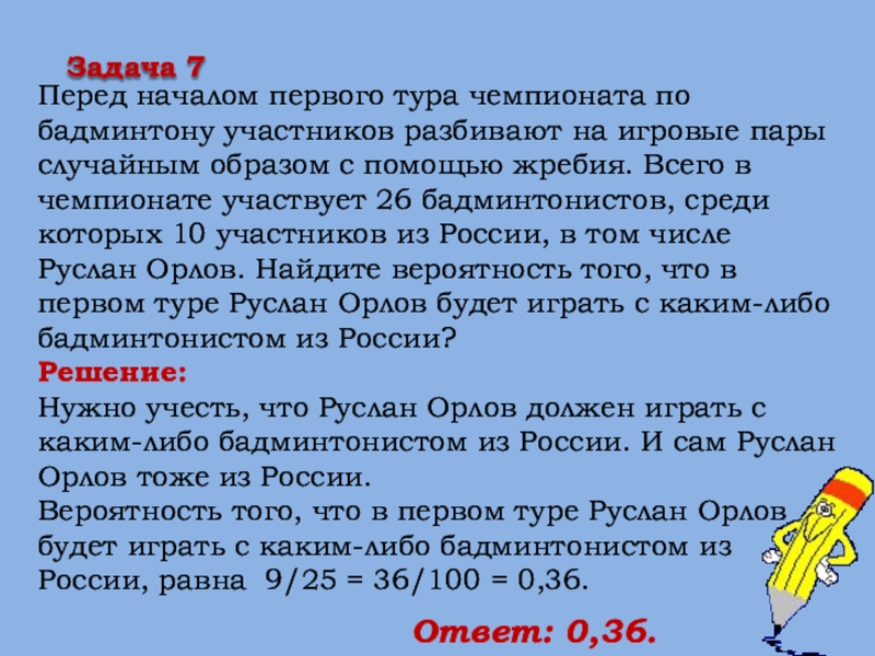 Вероятность того, что в первом туре Руслан Орлов будет играть с каким-либо бадминтонистом из России, равна 9/25 = 36/100 = 0,36.