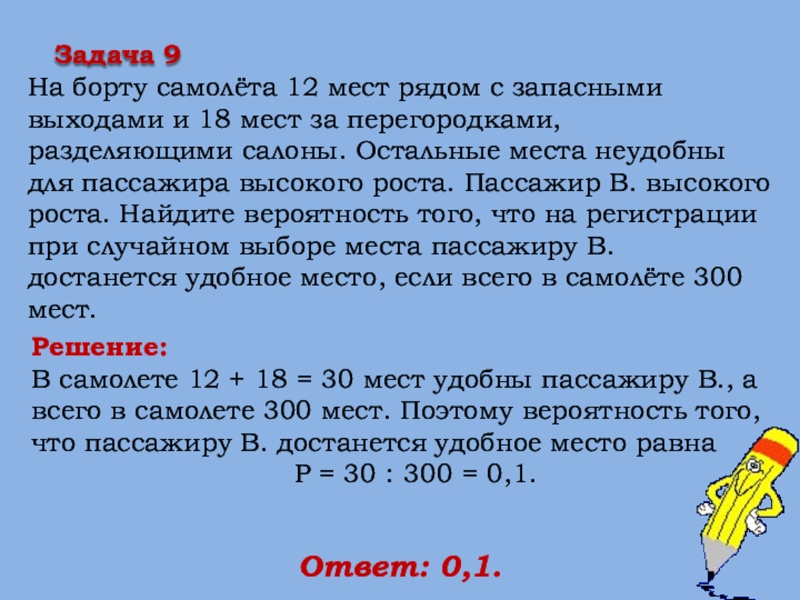 На борту самолёта 12 мест рядом с запасными выходами и 18 мест за перегородками, разделяющими салоны. Остальные места неудобны для пассажира высокого роста. Пассажир В. высокого роста. Найдите вероятность того, что на регистрации при случайном выборе места пассажиру В. достанется удобное место, если всего в самолёте 300 мест.