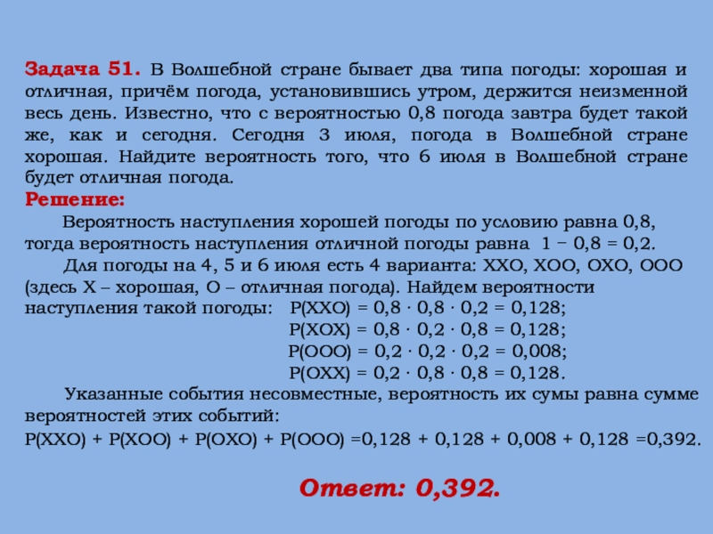 Задача 51. В Волшебной стране бывает два типа погоды: хорошая и отличная, причём погода, установившись утром, держится неизменной весь день. Известно, что с вероятностью 0,8 погода завтра будет такой же, как и сегодня. Сегодня 3 июля, погода в Волшебной стране хорошая. Найдите вероятность того, что 6 июля в Волшебной стране будет отличная погода.
