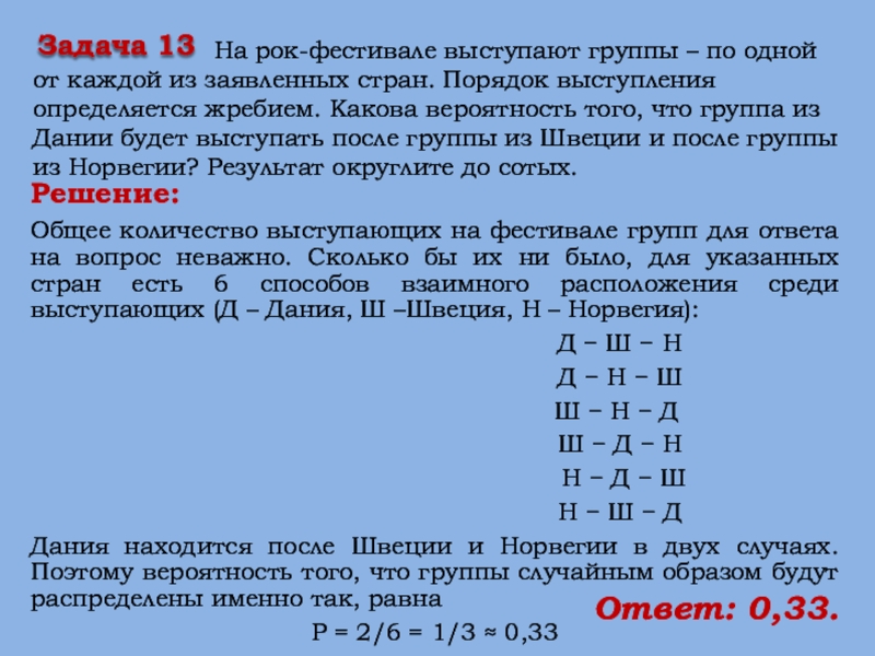 На рок-фестивале выступают группы – по одной от каждой из заявленных стран. Порядок выступления определяется жребием. Какова вероятность того, что группа из Дании будет выступать после группы из Швеции и после группы из Норвегии? Результат округлите до сотых.