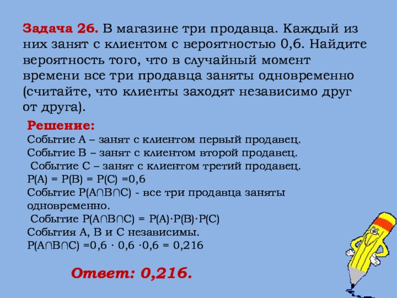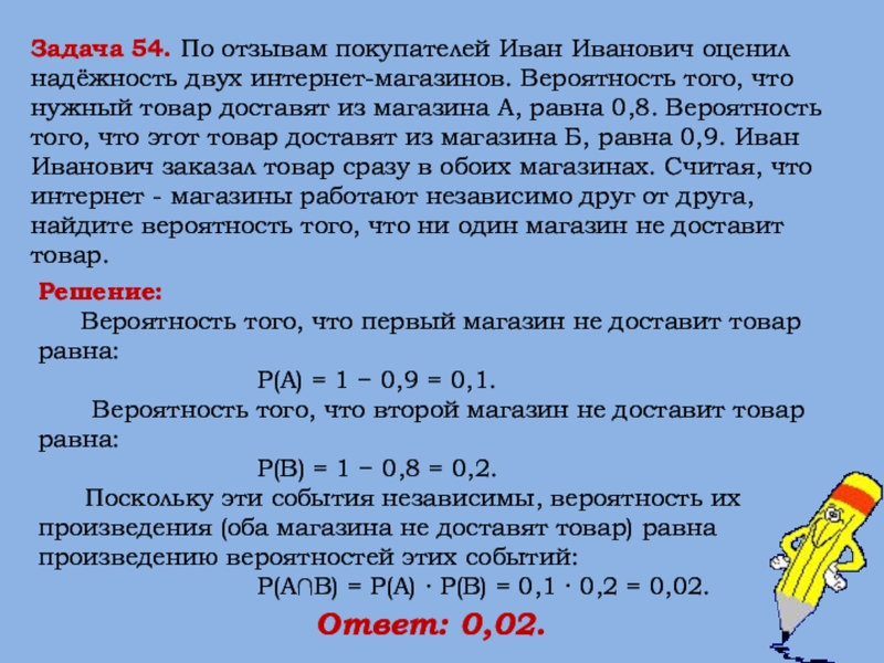 Задача 54. По отзывам покупателей Иван Иванович оценил надёжность двух интернет-магазинов. Вероятность того, что нужный товар доставят из магазина А, равна 0,8. Вероятность того, что этот товар доставят из магазина Б, равна 0,9. Иван Иванович заказал товар сразу в обоих магазинах. Считая, что интернет - магазины работают независимо друг от друга, найдите вероятность того, что ни один магазин не доставит товар.