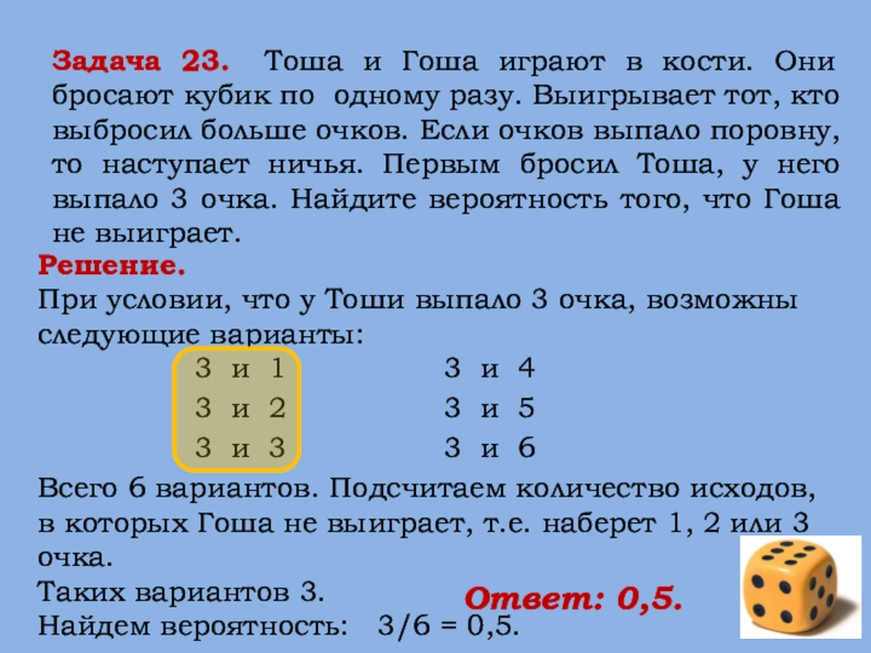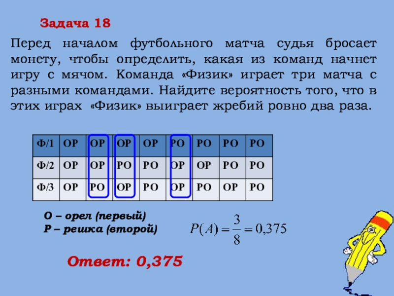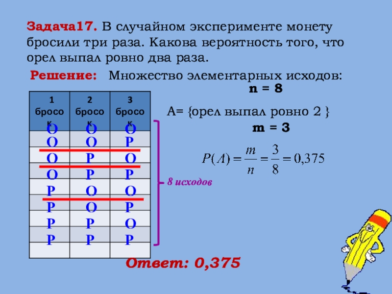 Задача17. В случайном эксперименте монету бросили три раза. Какова вероятность того, что орел выпал ровно два раза.