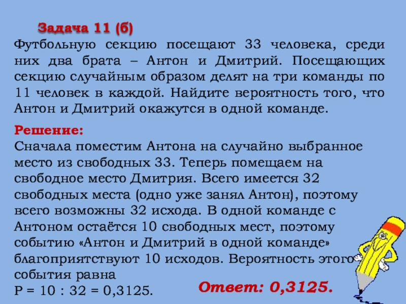Футбольную секцию посещают 33 человека, среди них два брата – Антон и Дмитрий. Посещающих секцию случайным образом делят на три команды по 11 человек в каждой. Найдите вероятность того, что Антон и Дмитрий окажутся в одной команде.