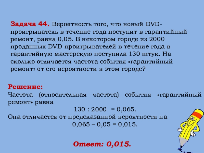 Задача 44. Вероятность того, что новый DVD-проигрыватель в течение года поступит в гарантийный ремонт, равна 0,05. В некотором городе из 2000 проданных DVD-проигрывателей в течение года в гарантийную мастерскую поступила 130 штук. На сколько отличается частота события «гарантийный ремонт» от его вероятности в этом городе?