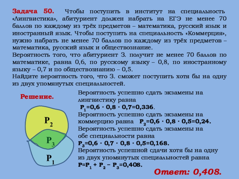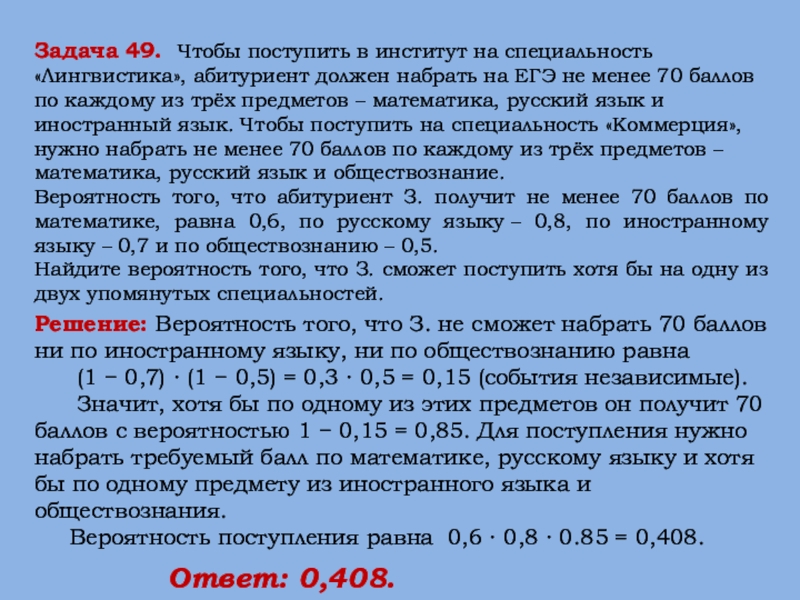 Задача 49. Чтобы поступить в институт на специальность «Лингвистика», абитуриент должен набрать на ЕГЭ не менее 70 баллов по каждому из трёх предметов – математика, русский язык и иностранный язык. Чтобы поступить на специальность «Коммерция», нужно набрать не менее 70 баллов по каждому из трёх предметов – математика, русский язык и обществознание.