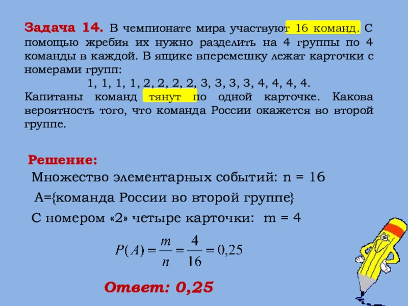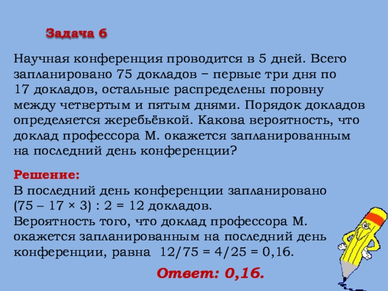 Вероятность того, что доклад профессора М. окажется запланированным на последний день конференции, равна 12/75 = 4/25 = 0,16.