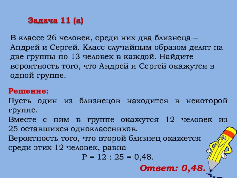 В классе 26 человек, среди них два близнеца – Андрей и Сергей. Класс случайным образом делят на две группы по 13 человек в каждой. Найдите вероятность того, что Андрей и Сергей окажутся в одной группе.