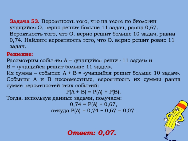 Задача 53. Вероятность того, что на тесте по биологии учащийся О. верно решит больше 11 задач, равна 0,67. Вероятность того, что О. верно решит больше 10 задач, равна 0,74. Найдите вероятность того, что О. верно решит ровно 11 задач.