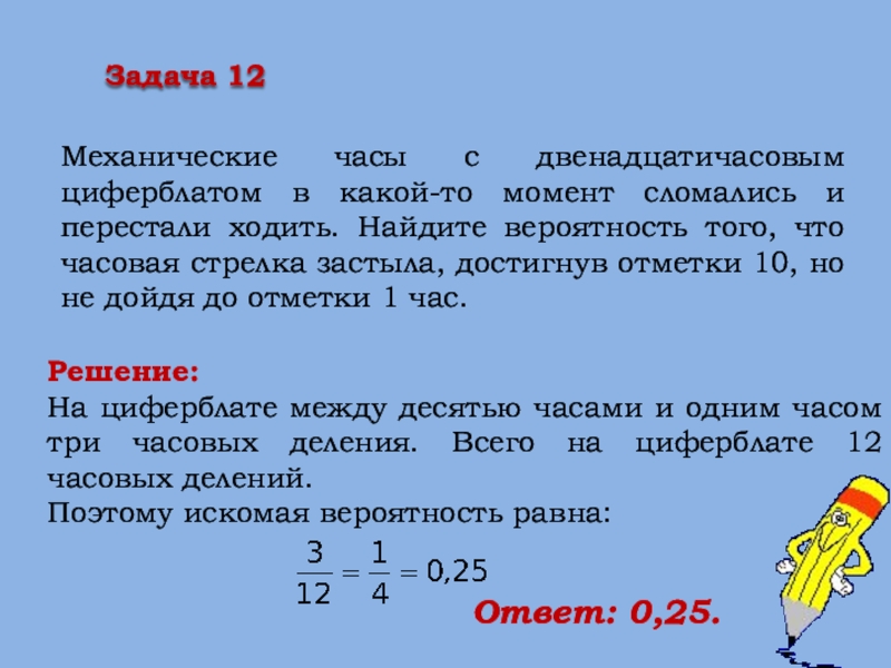 Механические часы с двенадцатичасовым циферблатом в какой-то момент сломались и перестали ходить. Найдите вероятность того, что часовая стрелка застыла, достигнув отметки 10, но не дойдя до отметки 1 час.