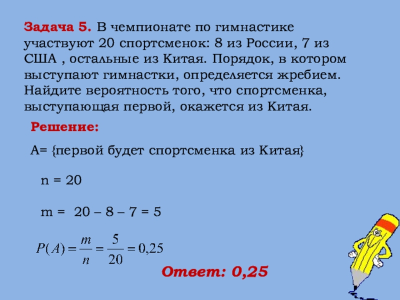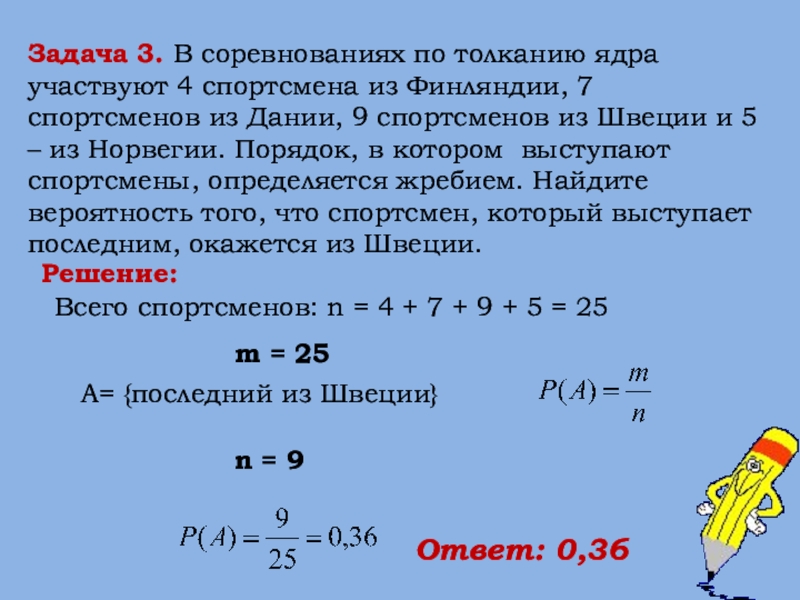 Всего спортсменов: n = 4 + 7 + 9 + 5 = 25