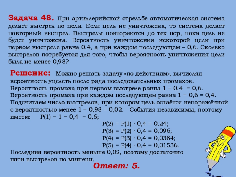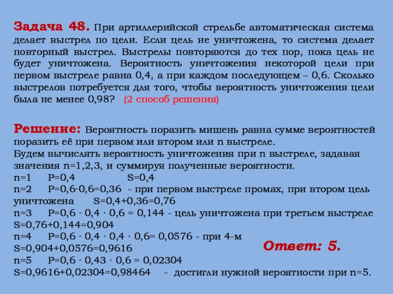 Задача 48. При артиллерийской стрельбе автоматическая система делает выстрел по цели. Если цель не уничтожена, то система делает повторный выстрел. Выстрелы повторяются до тех пор, пока цель не будет уничтожена. Вероятность уничтожения некоторой цели при первом выстреле равна 0,4, а при каждом последующем – 0,6. Сколько выстрелов потребуется для того, чтобы вероятность уничтожения цели была не менее 0,98?