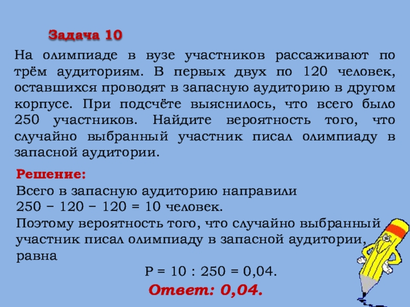 На олимпиаде в вузе участников рассаживают по трём аудиториям. В первых двух по 120 человек, оставшихся проводят в запасную аудиторию в другом корпусе. При подсчёте выяснилось, что всего было 250 участников. Найдите вероятность того, что случайно выбранный участник писал олимпиаду в запасной аудитории.