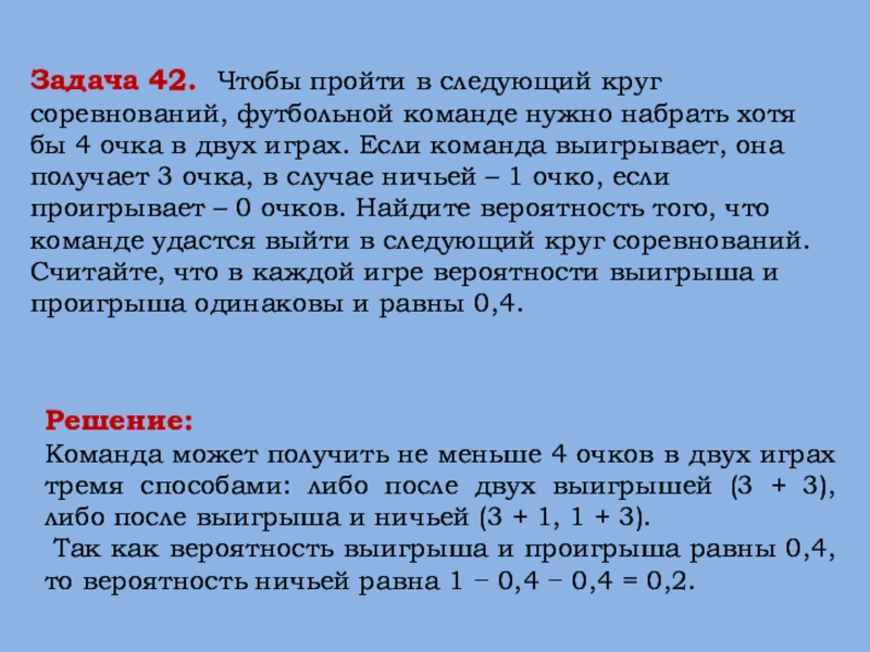 Задача 42. Чтобы пройти в следующий круг соревнований, футбольной команде нужно набрать хотя бы 4 очка в двух играх. Если команда выигрывает, она получает 3 очка, в случае ничьей – 1 очко, если проигрывает – 0 очков. Найдите вероятность того, что команде удастся выйти в следующий круг соревнований. Считайте, что в каждой игре вероятности выигрыша и проигрыша одинаковы и равны 0,4.