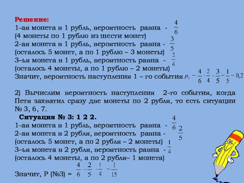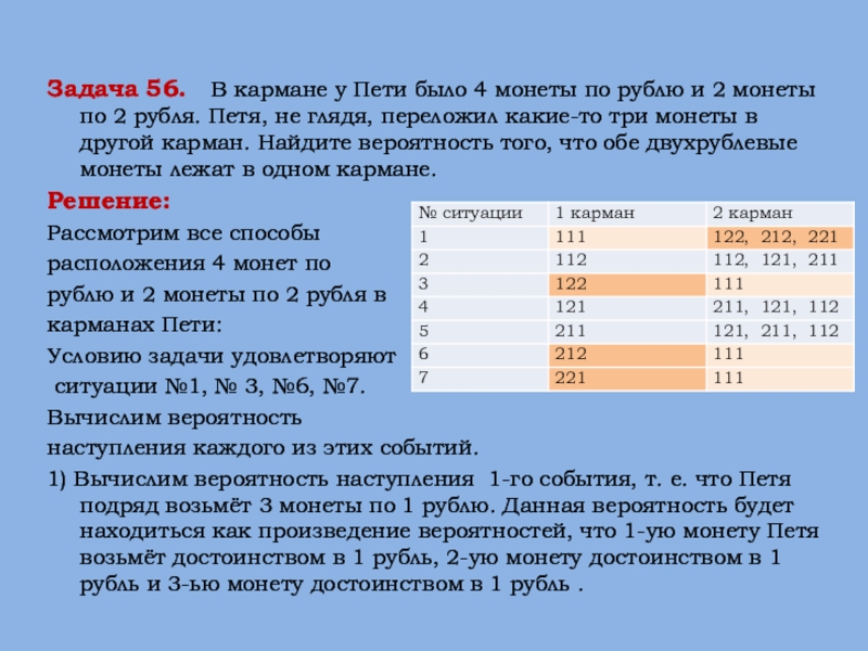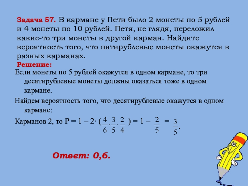 Найдем вероятность того, что десятирублевые окажутся в одном кармане: