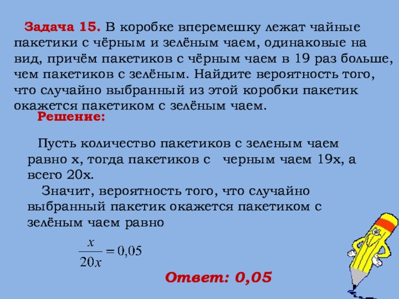 Значит, вероятность того, что случайно выбранный пакетик окажется пакетиком с зелёным чаем равно