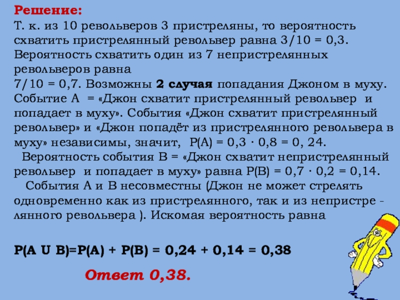 Р(А U В)=Р(А) + Р(В) = 0,24 + 0,14 = 0,38