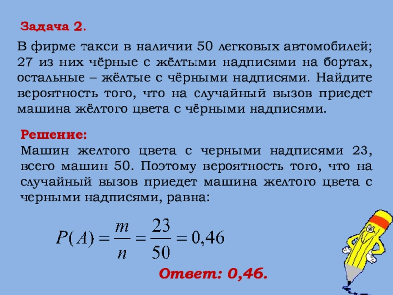 В фирме такси в наличии 50 легковых автомобилей; 27 из них чёрные с жёлтыми надписями на бортах, остальные – жёлтые с чёрными надписями. Найдите вероятность того, что на случайный вызов приедет машина жёлтого цвета с чёрными надписями.