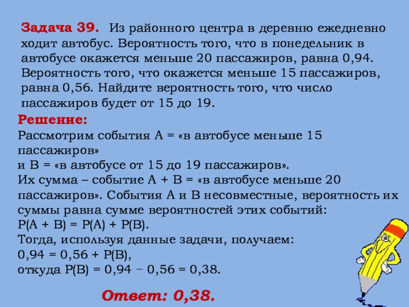 Задача 39. Из районного центра в деревню ежедневно ходит автобус. Вероятность того, что в понедельник в автобусе окажется меньше 20 пассажиров, равна 0,94. Вероятность того, что окажется меньше 15 пассажиров, равна 0,56. Найдите вероятность того, что число пассажиров будет от 15 до 19.