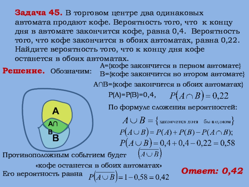 Задача 45. В торговом центре два одинаковых автомата продают кофе. Вероятность того, что к концу дня в автомате закончится кофе, равна 0,4. Вероятность того, что кофе закончится в обоих автоматах, равна 0,22. Найдите вероятность того, что к концу дня кофе останется в обоих автоматах.