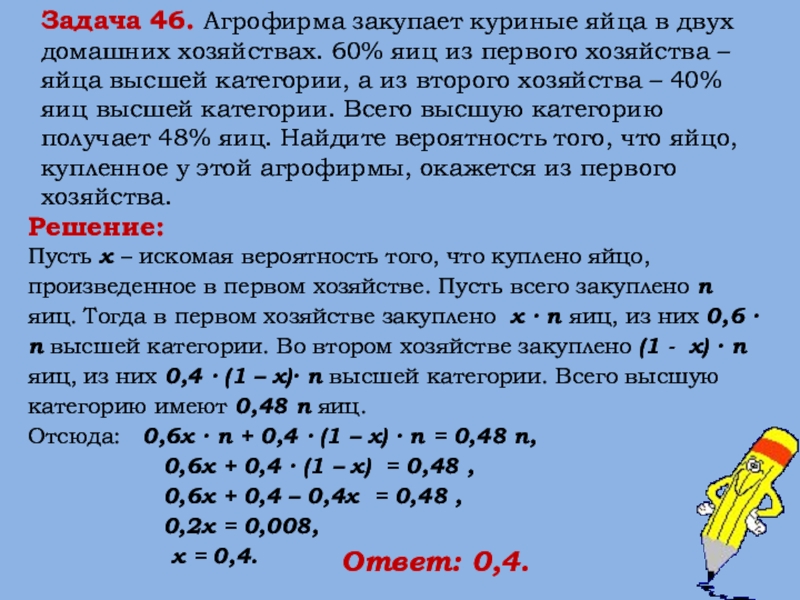 Задача 46. Агрофирма закупает куриные яйца в двух домашних хозяйствах. 60% яиц из первого хозяйства – яйца высшей категории, а из второго хозяйства – 40% яиц высшей категории. Всего высшую категорию получает 48% яиц. Найдите вероятность того, что яйцо, купленное у этой агрофирмы, окажется из первого хозяйства.