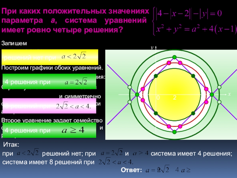 Второе уравнение задает семейство окружностей с центром (2;0) и радиусом а.