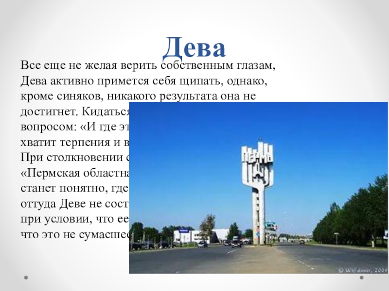 щипать, однако, кроме синяков, никакого результата она не достигнет. Кидаться к прохожим с тупым вопросом: «И где это я?» Дева не станет, ей хватит терпения и выдержки пойти другим путем. Пpи столкновении с табличкой с надписью типа «Пермская областная поликлиника № 31» и ежу станет понятно, где он находится. А уж выбраться оттуда Деве не составит большого труда. Конечно, при условии, что ее сознание смирится с мыслью, что это не сумасшествие, а реальность