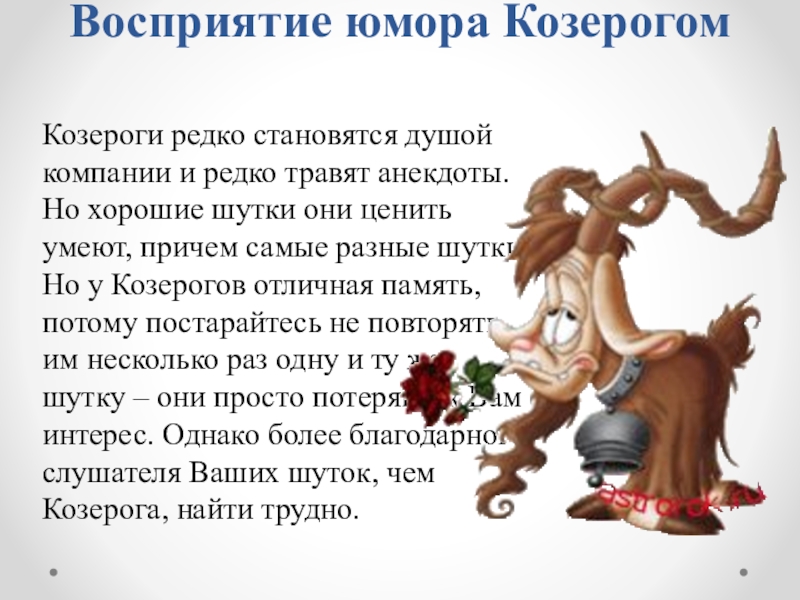 Но хорошие шутки они ценить умеют, причем самые разные шутки. Но у Козерогов отличная память, потому постарайтесь не повторять им несколько раз одну и ту же шутку – они просто потеряют к Вам интерес. Однако более благодарного слушателя Ваших шуток, чем Козерога, найти трудно.