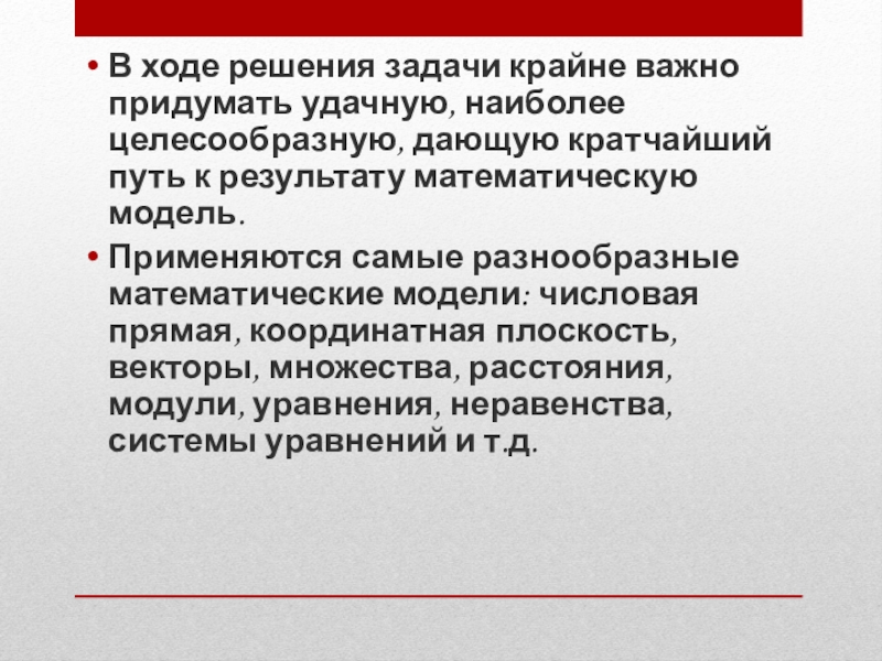 Применяются самые разнообразные математические модели: числовая прямая, координатная плоскость, векторы, множества, расстояния, модули, уравнения, неравенства, системы уравнений и т.д.