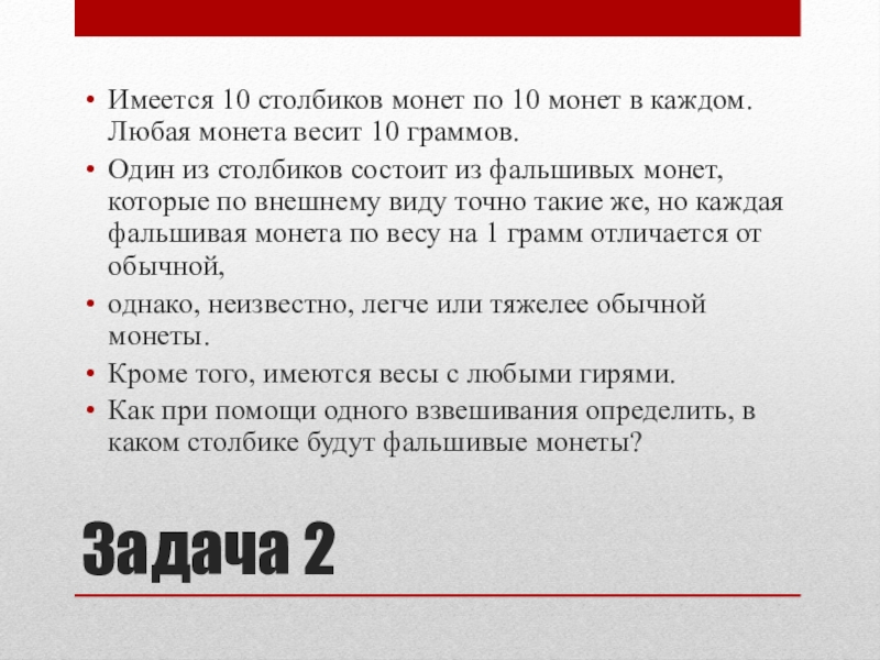 Имеется 10 столбиков монет по 10 монет в каждом. Любая