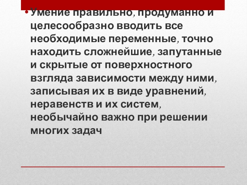 Слайд 5Умение правильно, продуманно и целесообразно вводить все необходимые переменные, точно находить