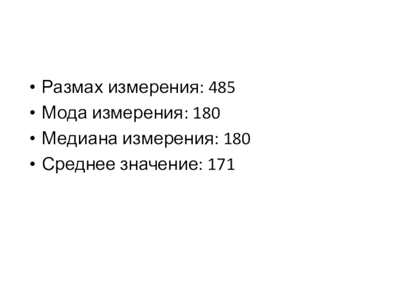 Размах измерения: 485Мода измерения: 180Медиана измерения: 180Среднее значение: 171