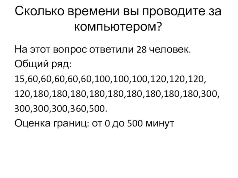 Сколько времени вы проводите за компьютером? На этот вопрос ответили 28 человек.Общий ряд:15,60,60,60,60,60,100,100,100,120,120,120,120,180,180,180,180,180,180,180,180,180,300,300,300,300,360,500.Оценка границ: от 0 до 500 минут