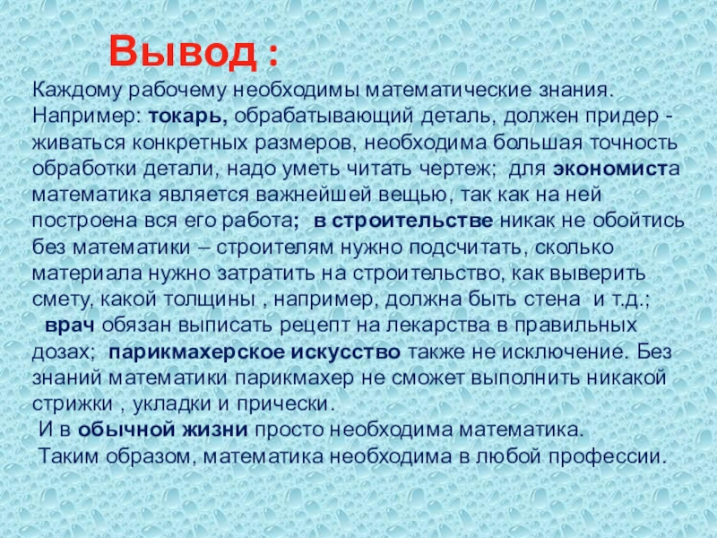 Каждому рабочему необходимы математические знания. Например: токарь, обрабатывающий деталь, должен придер -живаться конкретных размеров, необходима большая точность обработки детали, надо уметь читать чертеж; для экономиста математика является важнейшей вещью, так как на ней построена вся его работа; в строительстве никак не обойтись без математики – строителям нужно подсчитать, сколько материала нужно затратить на строительство, как выверить смету, какой толщины , например, должна быть стена и т.д.;