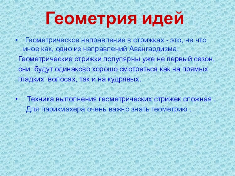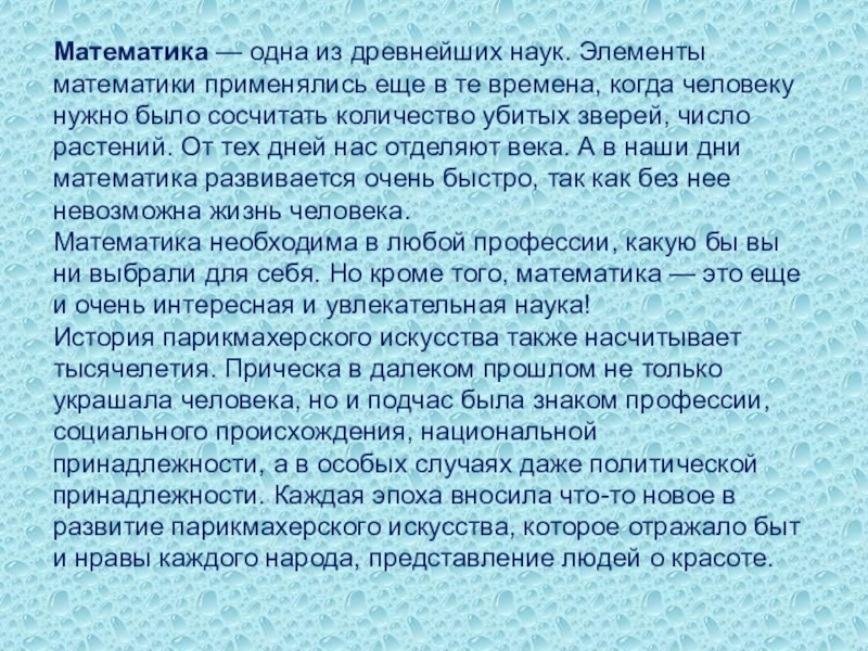 врач обязан выписать рецепт на лекарства в правильных дозах; парикмахерское искусство также не исключение. Без знаний математики парикмахер не сможет выполнить никакой стрижки , укладки и прически.