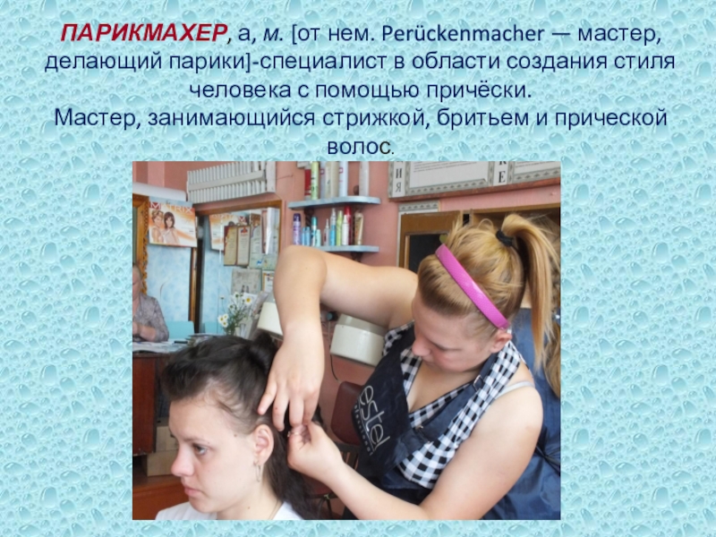 Слайд 6ПАРИКМАХЕР, а, м. [от нем. Perückenmacher — мастер, делающий парики]-специалист в