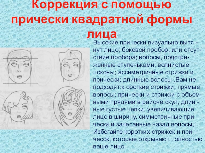 Слайд 14Коррекция с помощью прически квадратной формы лица