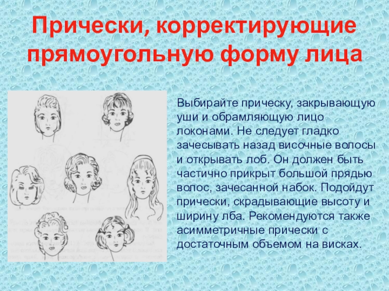Слайд 15Прически, корректирующие прямоугольную форму лица