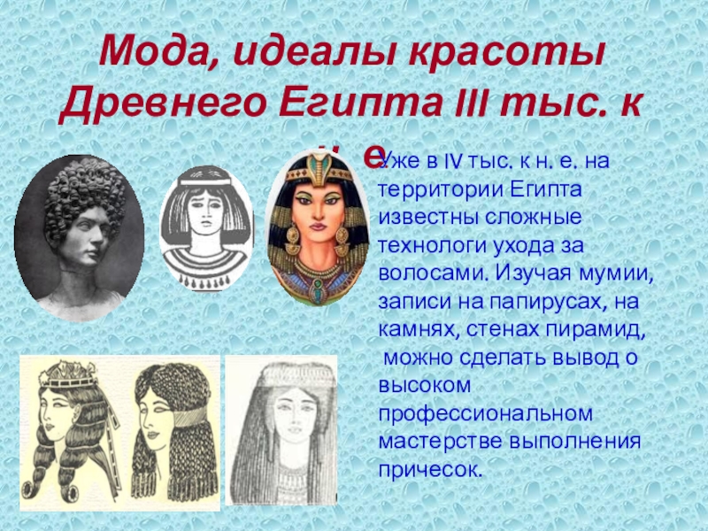 в IV тыс. к н. е. на территории Египта известны сложные технологи ухода за волосами. Изучая мумии, записи на папирусах, на камнях, стенах пирамид,