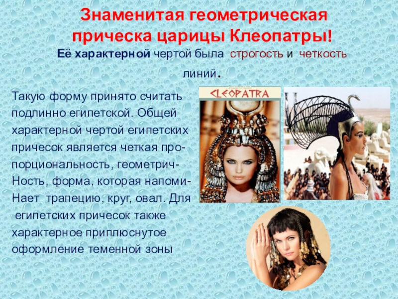 Слайд 5 Знаменитая геометрическая прическа царицы Клеопатры!