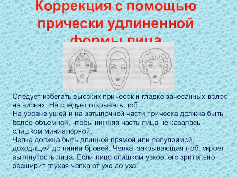 Слайд 16Коррекция с помощью прически удлиненной формы лица