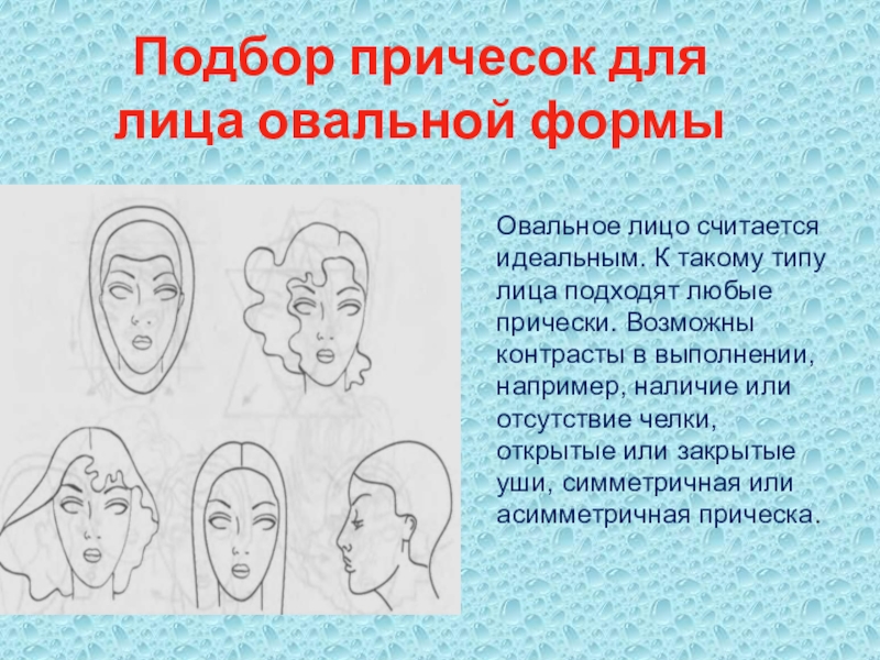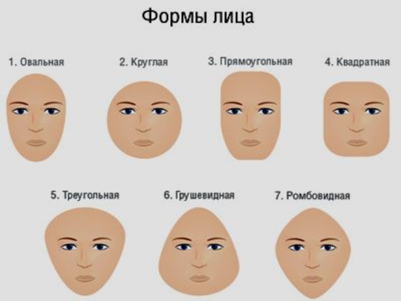 лицо; боковой пробор, или отсут-ствие пробора; волосы, подстри- женные ступеньками; волнистые локоны; ассиметричные стрижки и прически; длинные волосы .Вам не подходят:к ороткие стрижки; прямые