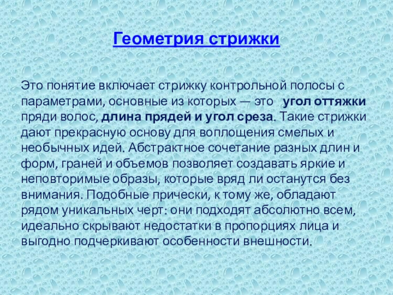 которых — это угол оттяжки пряди волос, длина прядей и угол среза. Такие стрижки дают прекрасную основу для воплощения смелых и необычных идей. Абстрактное сочетание разных длин и форм, граней и объемов позволяет создавать яркие и неповторимые образы, которые вряд ли останутся без внимания. Подобные прически, к тому же, обладают рядом уникальных черт: они подходят абсолютно всем, идеально скрывают недостатки в пропорциях лица и выгодно подчеркивают особенности внешности.