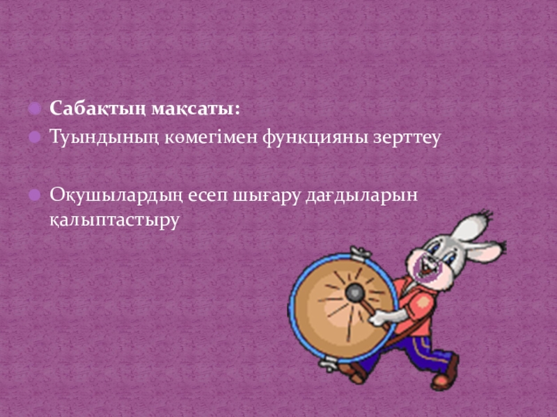 Сабақтың мақсаты: Туындының көмегімен функцияны зерттеу Оқушылардың есеп шығару дағдыларын қалыптастыру