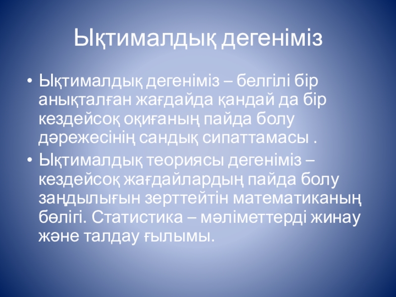 Ықтималдық теориясы дегеніміз – кездейсоқ жағдайлардың пайда болу заңдылығын зерттейтін математиканың бөлігі. Статистика – мәліметтерді жинау және талдау ғылымы.