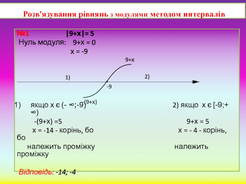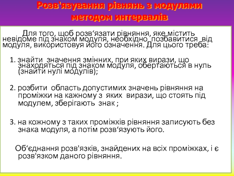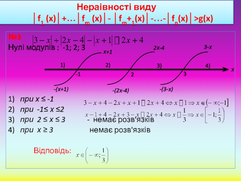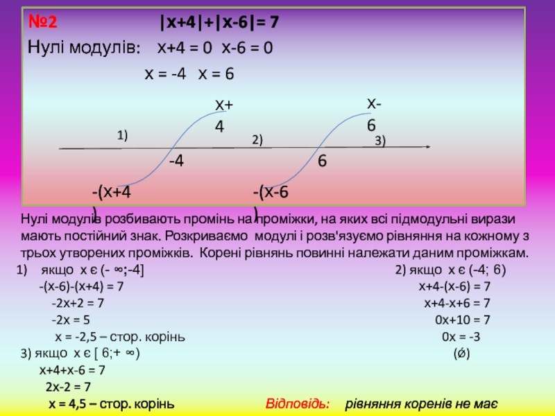 Нулі модулів розбивають промінь на проміжки, на яких всі підмодульні вирази мають постійний знак. Розкриваємо модулі і розв'язуємо рівняння на кожному з трьох утворених проміжків. Корені рівнянь повинні належати даним проміжкам.