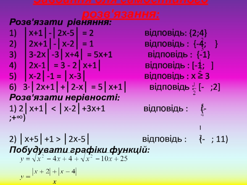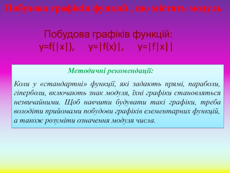 Коли у «стандартні» функції, які задають прямі, параболи, гіперболи, включають знак модуля, їхні графіки становляться незвичайними. Щоб навчити будувати такі графіки, треба володіти прийомами побудови графіків елементарних функцій, а також розуміти означення модуля числа.