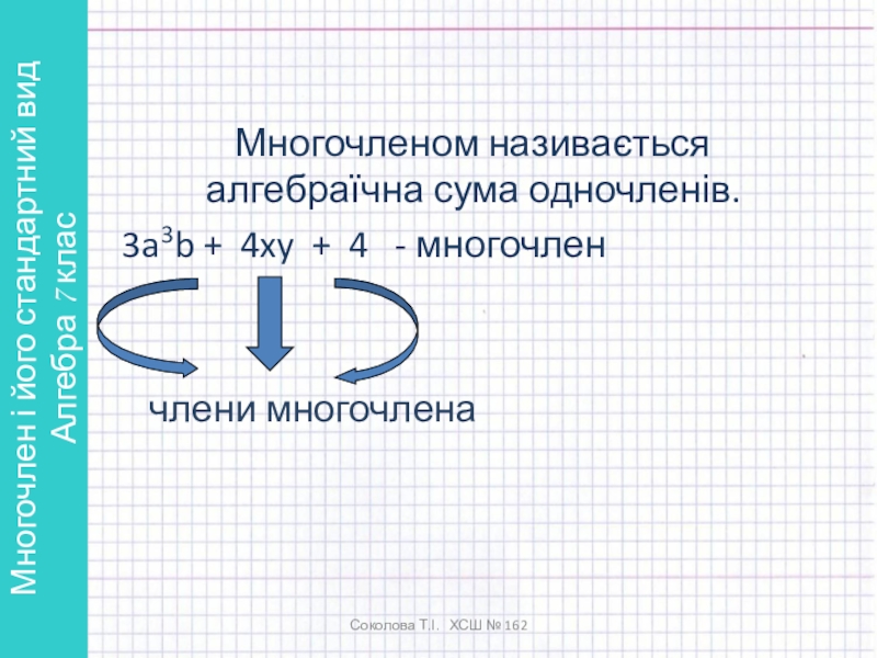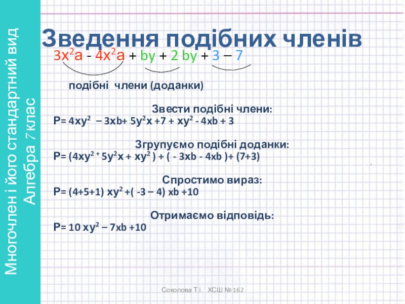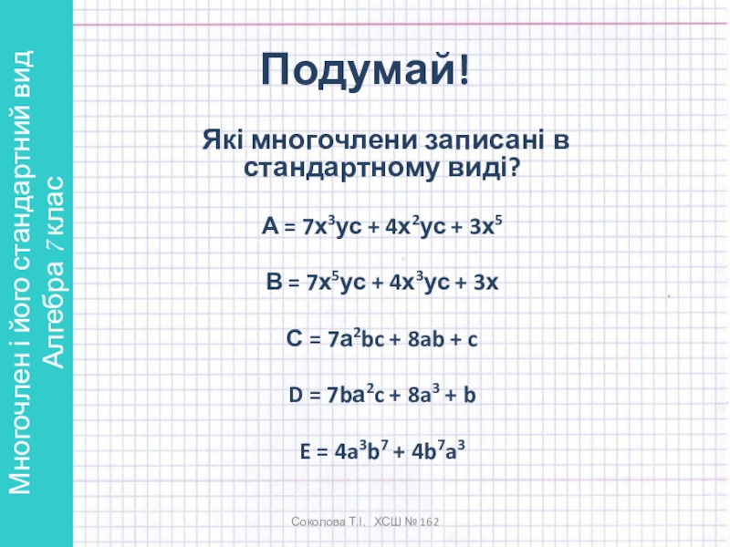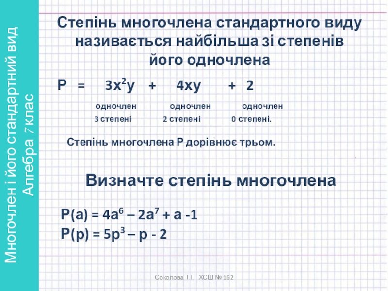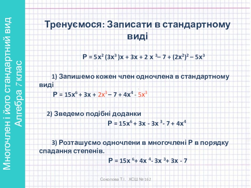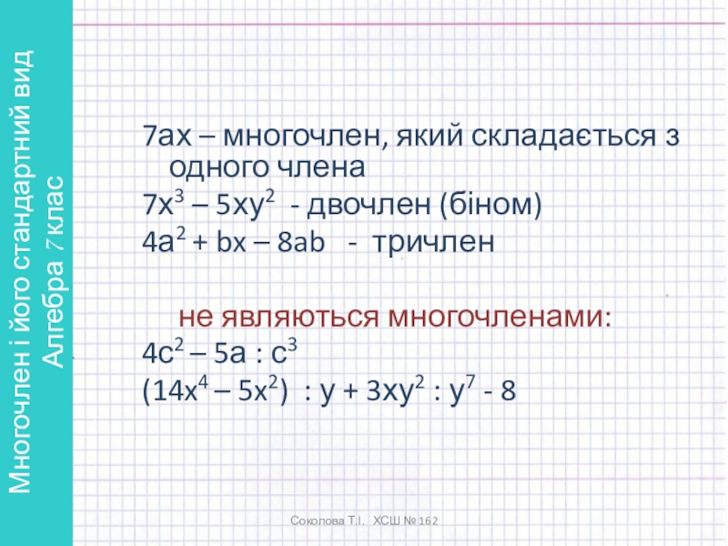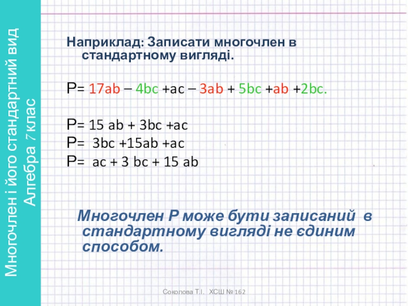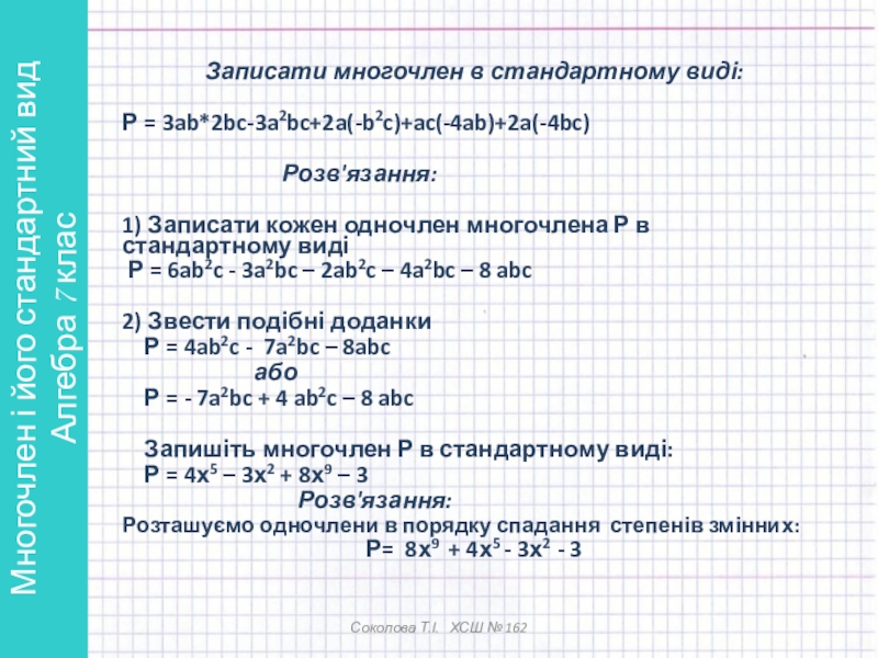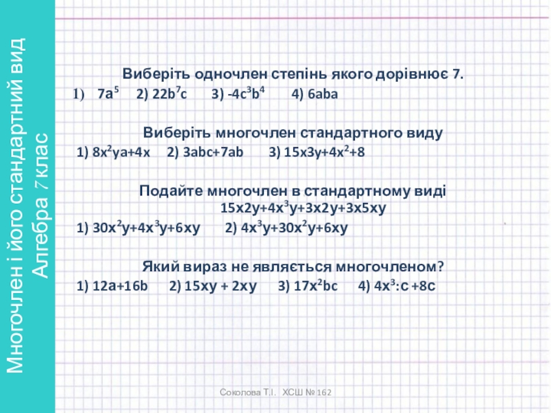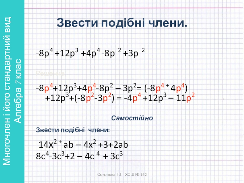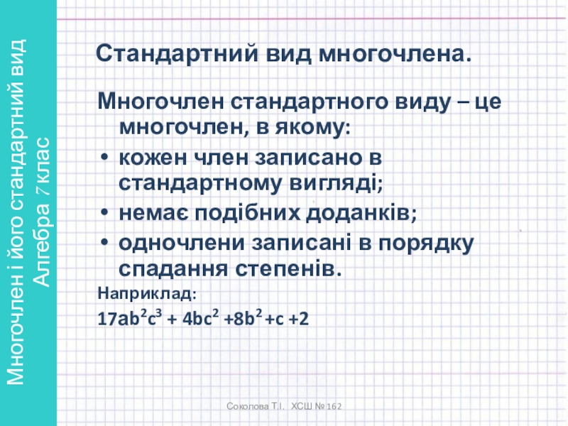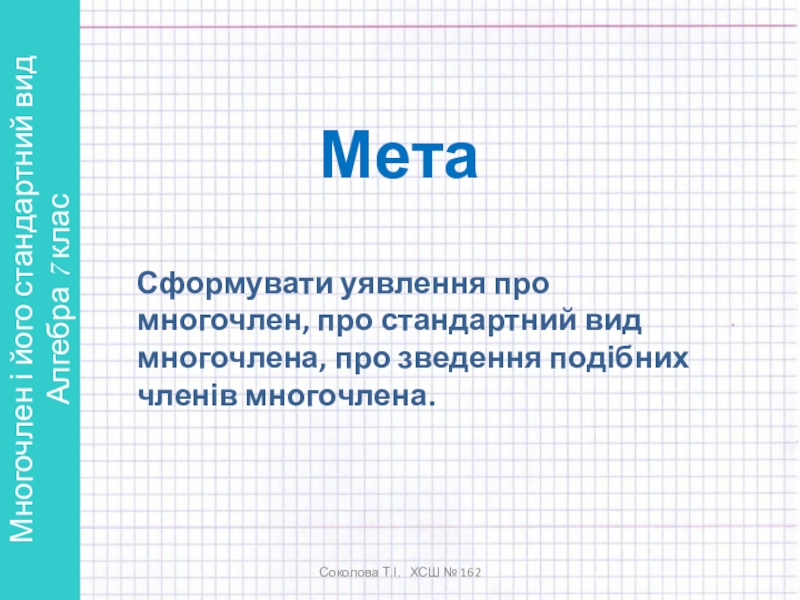Сформувати уявлення про многочлен, про стандартний вид многочлена, про зведення подібних членів многочлена.