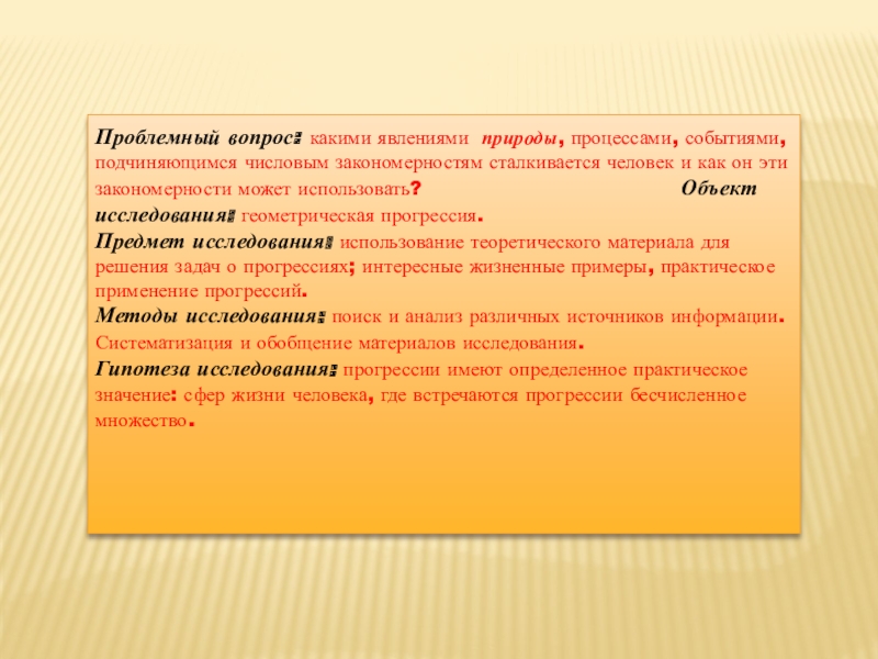 человек и как он эти закономерности может использовать? Объект исследования: геометрическая прогрессия. Предмет исследования: использование теоретического материала для решения задач о прогрессиях; интересные жизненные примеры, практическое применение прогрессий.