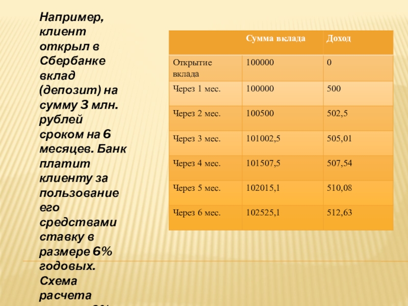 рублей сроком на 6 месяцев. Банк платит клиенту за пользование его средствами ставку в размере 6% годовых. Схема расчета такова: 6% ÷ 12 (месяцев) = 0,5% в месяц, тогда получаем