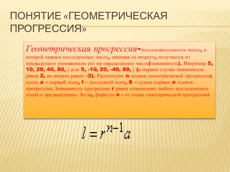 начиная со второго, получается из предыдущего умножением его на определённое число(знаменатель). Например 5, 10, 20, 40, 80, ј или 5, -10, 20, -40, 80, ј (в первом случае знаменатель равен 2, во втором равен –2). Рассмотрим n членов геометрической прогрессии; пусть a – первый член, l – последний член, S – сумма первых n членов прогрессии. Знаменатель прогрессии r равен отношению любого последующего члена к предыдущему. Тогда, формула n - го члена геометрической прогрессии: